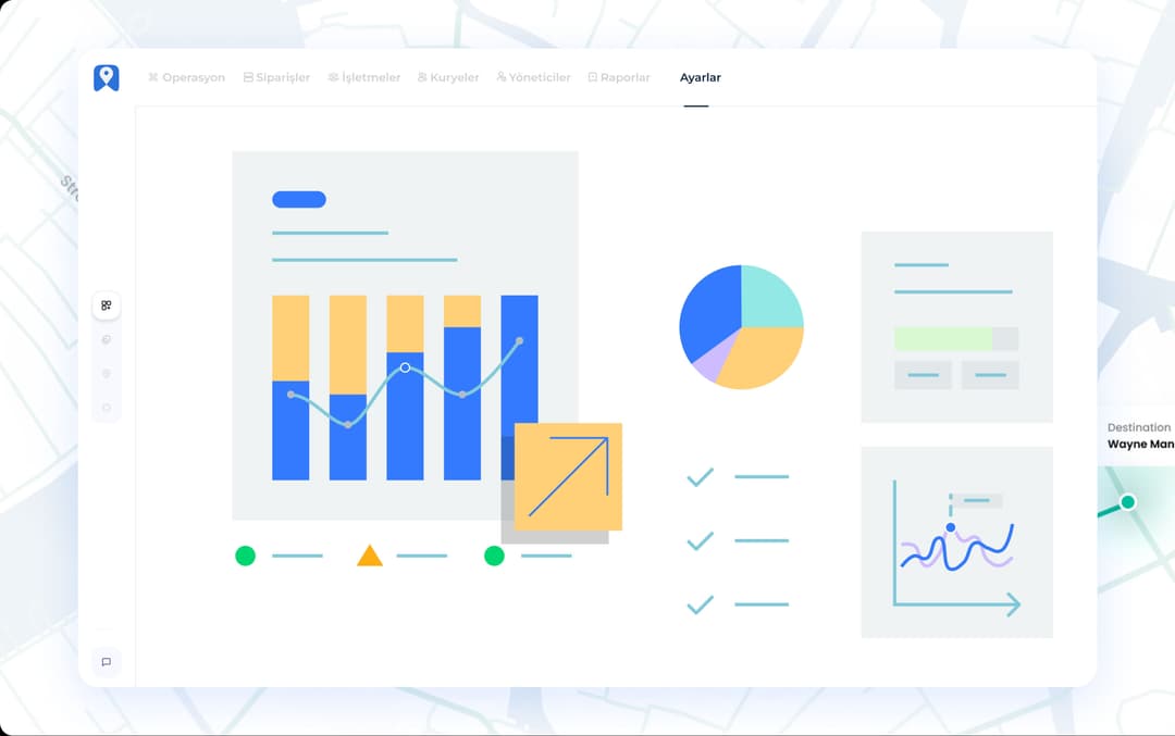 Paket teslimatında şeffaflık ve kontrol sizde! Kuryelerinizin gerçek zamanlı harita üzerinden konumlarını takip edebilirsiniz. Bu sayede: Olası gecikmelerin veya aksaklıkların önüne geçebilir, proaktif çözümler üretebilirsiniz. Takip sistemini de biz yazdık :)